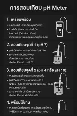 - ใช้ สารละลายบัฟเฟอร์มาตรฐาน (buffer solution) อย่างน้อย 2 ค่า เช่น pH 4.00, 7.00, และ 10.00